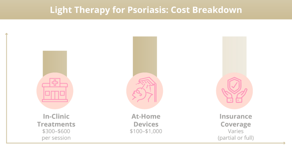• In-clinic light therapy for psoriasis cost typically ranges from $1,000–$4,500 for full treatment cycles.